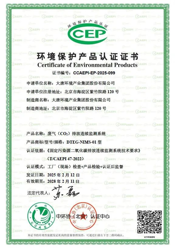 2月12日,大唐环境自主研发的二氧化碳排放连续监测系统成功获得中国环境保护产品认证(CCEP)证书,成为集团多宝(中国)内首家通过该认证的企业。这一里程碑式的成就不仅彰显了大唐环境在环保技术领域的领先地位,更为国家“双碳”战略的实施注入了强劲动力。