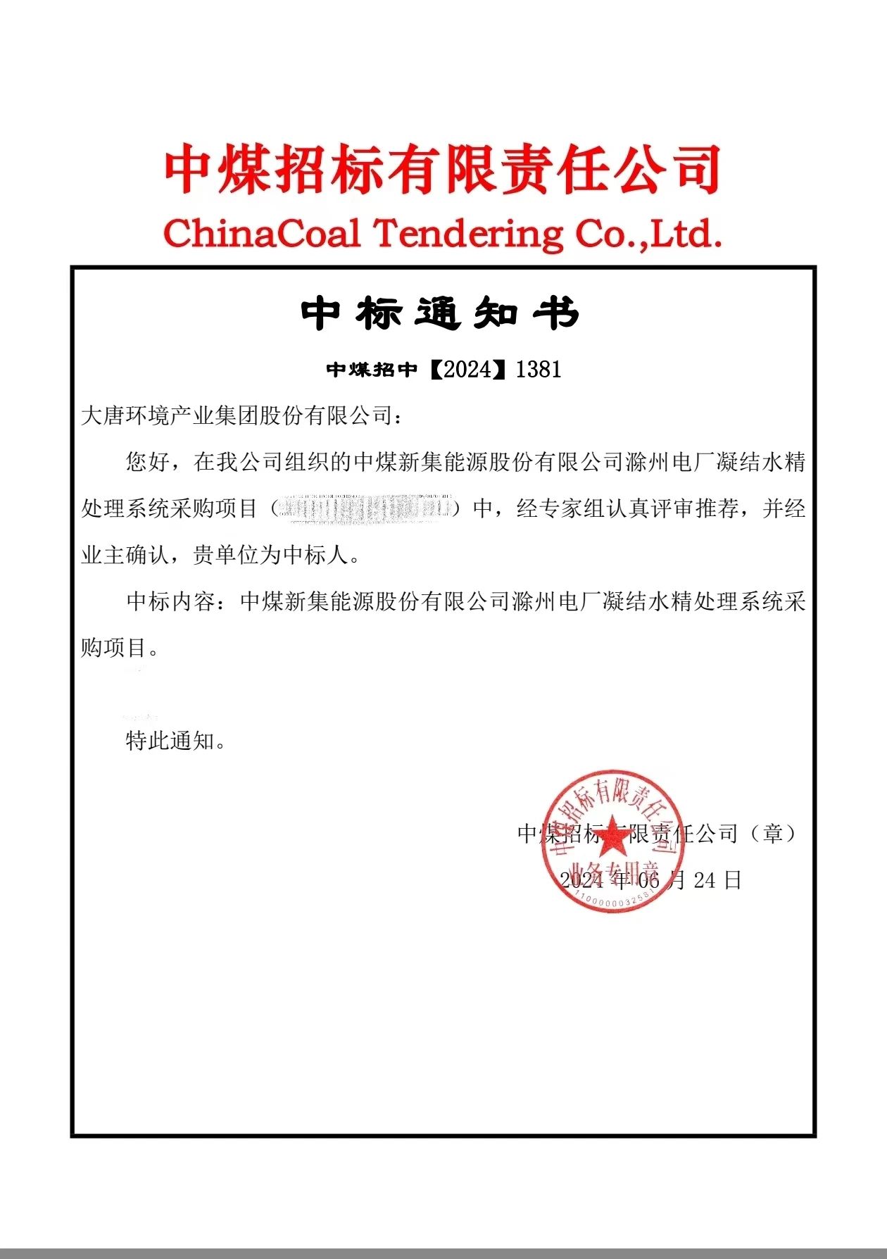 本网讯 近日,水务多宝(中国)成功中标中煤滁州电厂凝结水精处理项目。