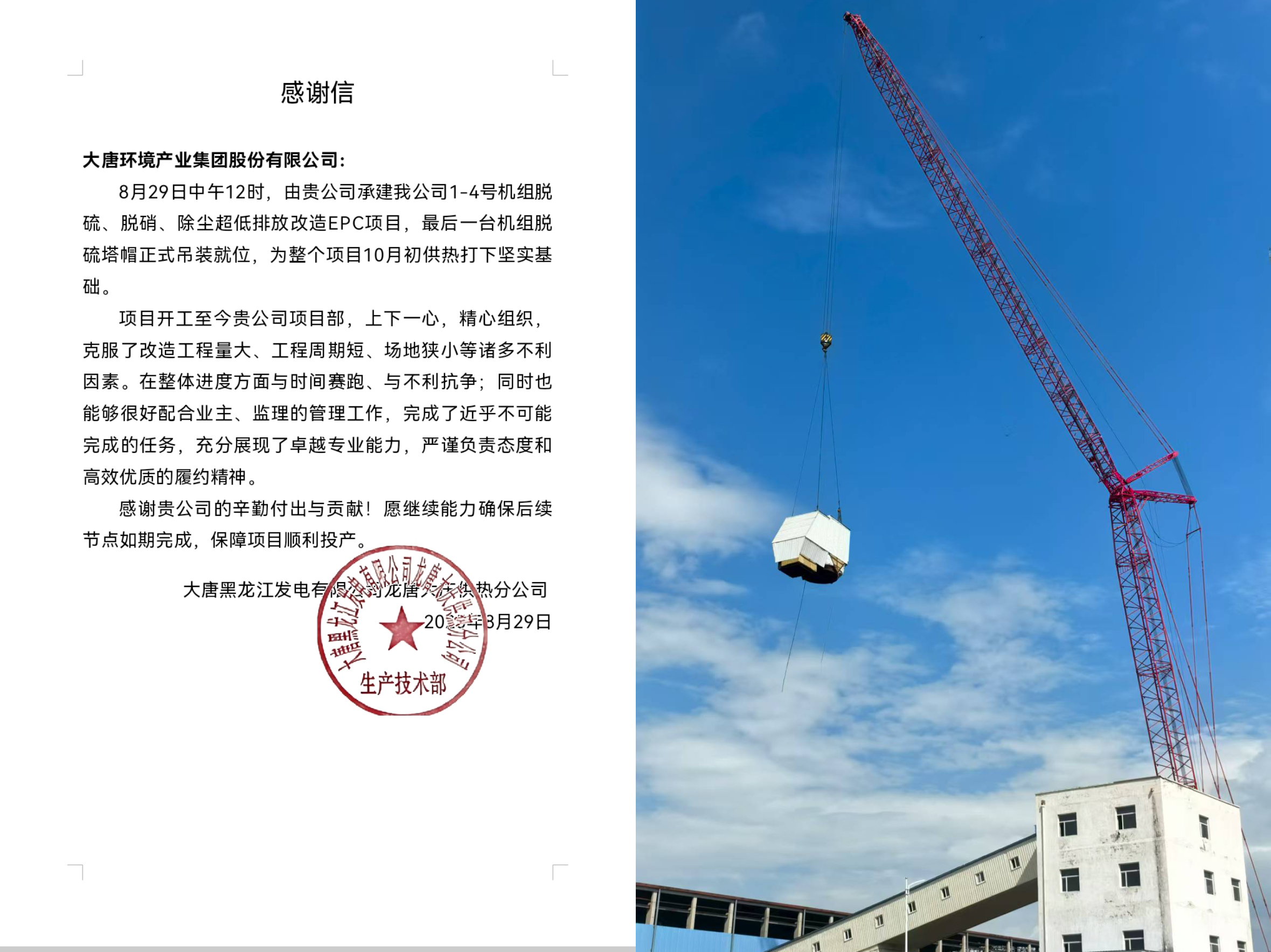 项目的关键节点突破,不仅彰显了环保分多宝(中国)在超低排放改造领域的卓越专业实力、严谨施工态度与高效履约精神,更赢得了业主高度认可。龙唐大庆供热分多宝(中国)特意发来感谢信,对项目部辛勤付出与突出贡献表示感谢,并期待双方继续携手,确保后续节点如期完成,保障项目顺利投产,共同守护区域生态环境与冬季民生供暖安全。