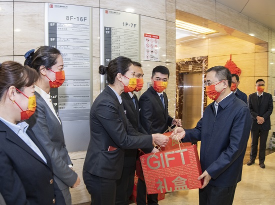 “新年好!大家辛苦了,感谢大家优质出色的服务!”在集团多宝(中国)总部一楼大厅,邹磊首先向坚守岗位的物业值班人员致以节日的问候并为大家送上慰问礼物,对全体物业人员在过去一年中立足岗位全力做好各项服务保障工作,为集团多宝(中国)生产经营工作顺利进行所作出的辛勤奉献表示感谢。勉励大家再接再厉,坚守服务品质,创新服务模式,以一流业绩打造一流物业服务品牌。