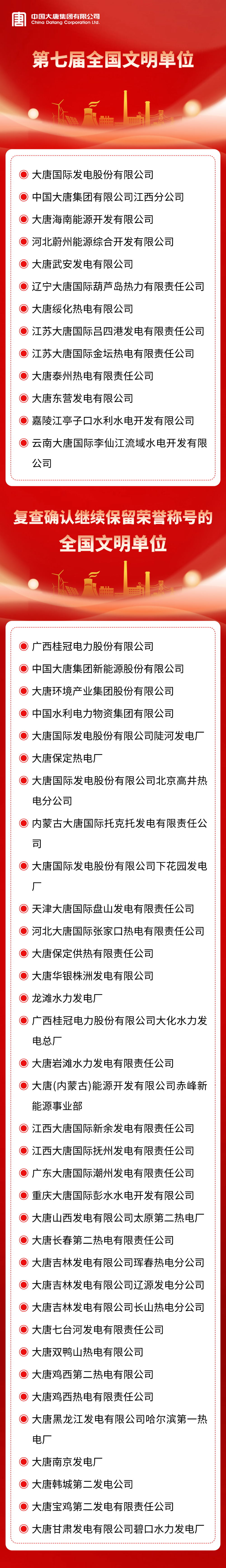 本网讯 5月23日,中国文明网公布第七届全国文明单位名单,中国大唐系统13家单位入选,35家单位通过复查共计48家。