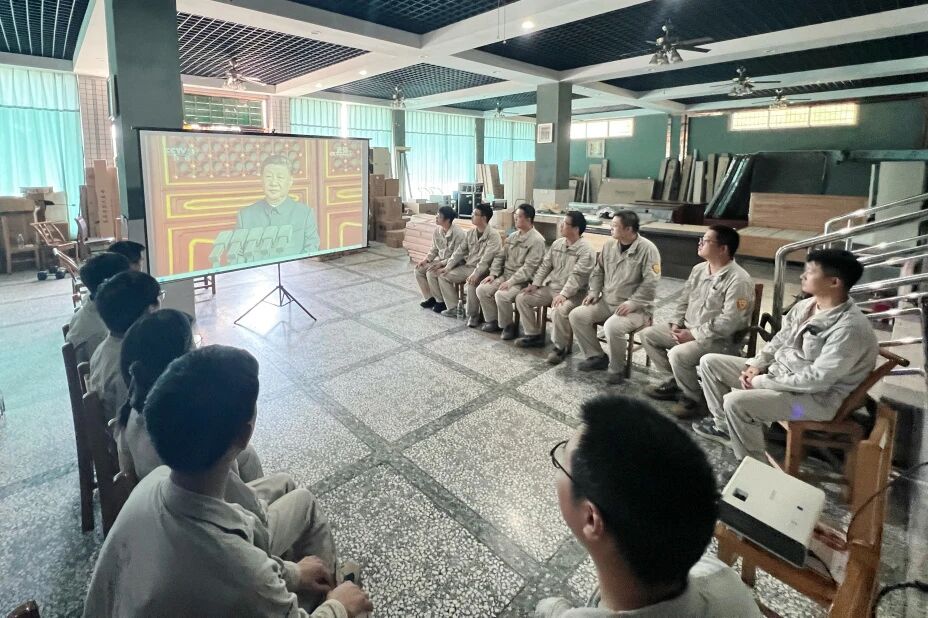 宁夏分多宝(中国)组织职工收听收看九三阅兵直播,共同见证这一激动人心的历史时刻,眼神中充满了自豪与敬意。