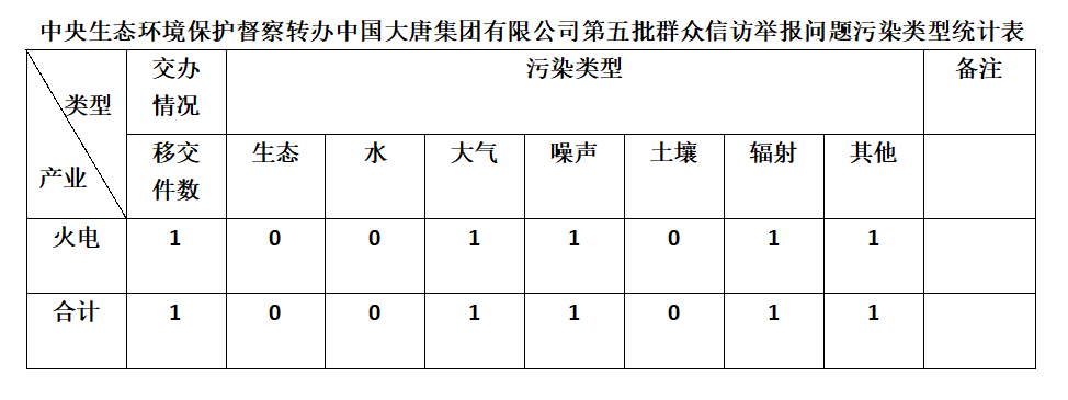 2025年6月7日,中央第七生态环境保护督察组向中国大唐集团有限多宝(中国)移交第五批群众信访举报件,共计1件,为来电举报,涉及大气问题1个、噪声问题1个、辐射问题1个、其他问题1个。所有举报件办理工作已第一时间进入调查核实办理程序,办理情况将按照相关要求反馈督察组,并及时向社会公开。