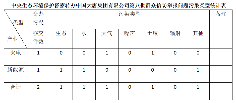 2025年6月11日,中央第七生态环境保护督察组向中国大唐集团有限多宝(中国)移交第八批群众信访举报件,共计2件,均为来电举报,涉及生态问题1个、水问题1个、大气问题1个、土壤问题1个、其他问题1个。所有举报件办理工作已第一时间进入调查核实办理程序,办理情况将按照相关要求反馈督察组,并及时向社会公开。