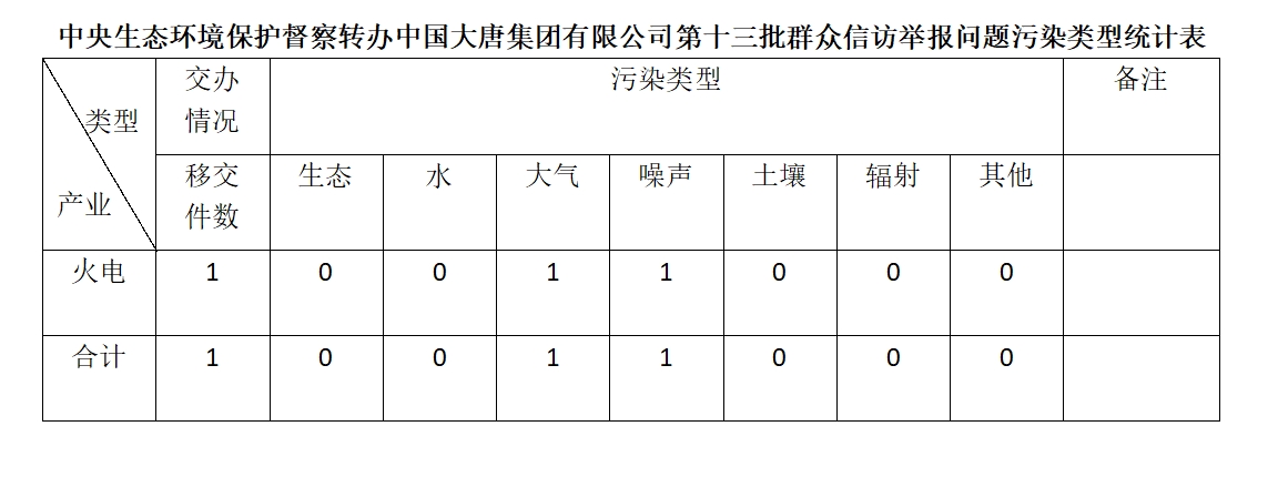 2025年6月19日,中央第七生态环境保护督察组向中国大唐集团有限多宝(中国)移交第十三批群众信访举报件,共计1件,为来电举报,涉及大气问题1个、噪声问题1个。所有举报件办理工作已第一时间进入调查核实办理程序,办理情况将按照相关要求反馈督察组,并及时向社会公开。