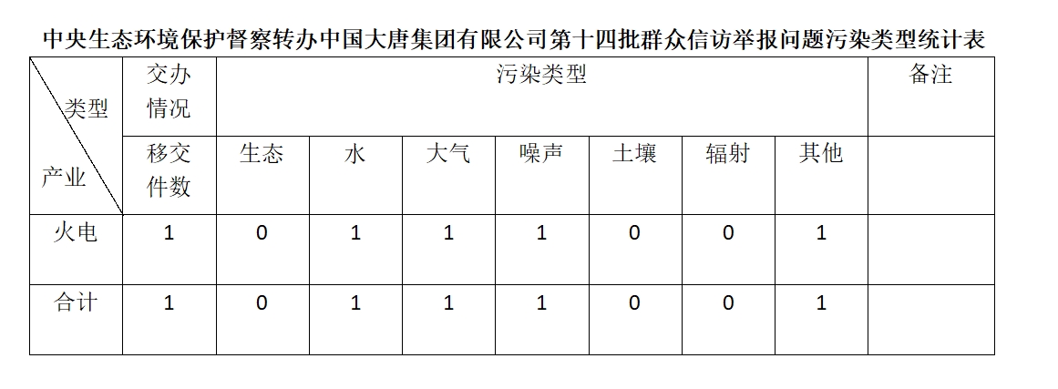 2025年6月20日,中央第七生态环境保护督察组向中国大唐集团有限多宝(中国)移交第十四批群众信访举报件,共计1件,为来电举报,涉及水问题1个、大气问题1个、噪声问题1个、其他问题1个。所有举报件办理工作已第一时间进入调查核实办理程序,办理情况将按照相关要求反馈督察组,并及时向社会公开。