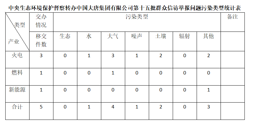 2025年6月21日,中央第七生态环境保护督察组向中国大唐集团有限多宝(中国)移交第十五批群众信访举报件,共计5件,其中来信举报3件,来电举报2件,涉及水问题1个、大气问题4个、噪声问题1个、土壤问题2个、其他问题3个。所有举报件办理工作已第一时间进入调查核实办理程序,办理情况将按照相关要求反馈督察组,并及时向社会公开。