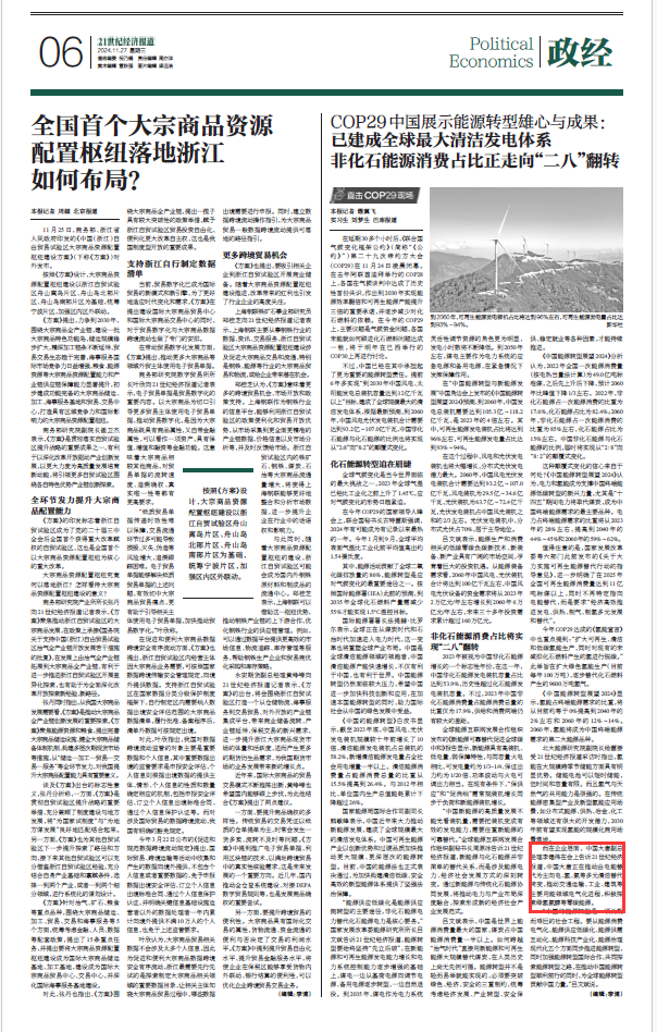 《中国的能源转型》白皮书显示,截至2023年底,中国风电、光伏发电装机规模较十年前增长了10倍,清洁能源发电装机占总装机的58.2%,新增清洁能源发电量占全社会用电增量一半以上。清洁能源消费量占能源消费总量的比重从15.5%提高到26.4%。与2012年相比,单位国内生产总值能耗累计下降超过26%。