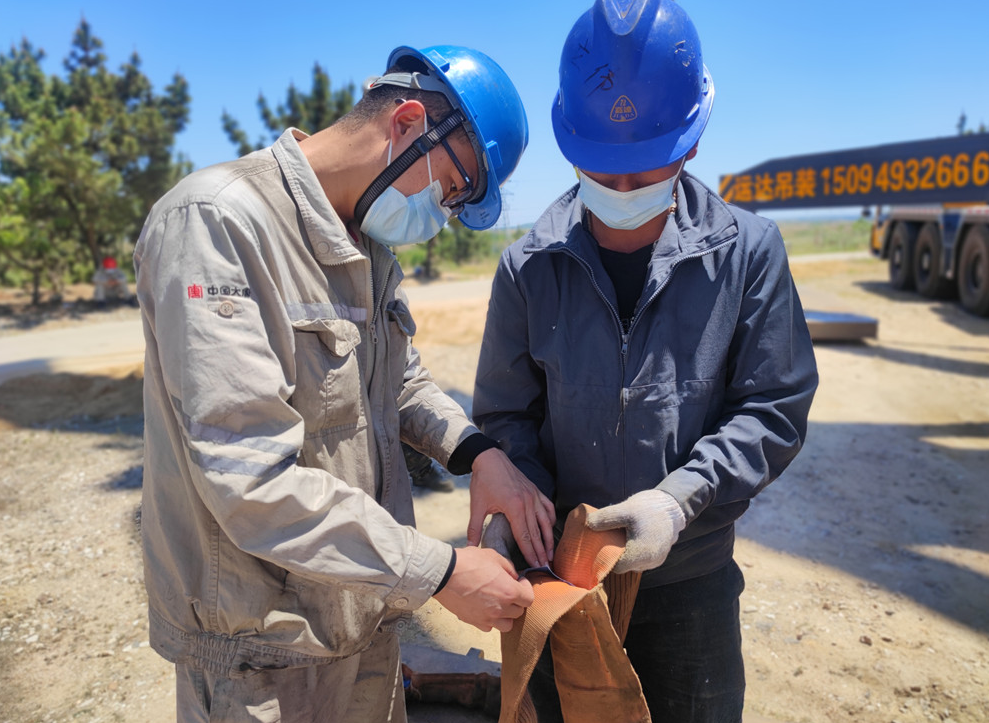 莱州一期技改现场,监察人员在吊装前对吊带进行安全检查(刘思洋/摄)